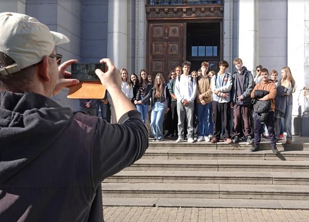 Fodor tanár úr fotózza a 10B-t és a 12C-t a Páduai Szent Antal (minorita) templom lépcsőjénél