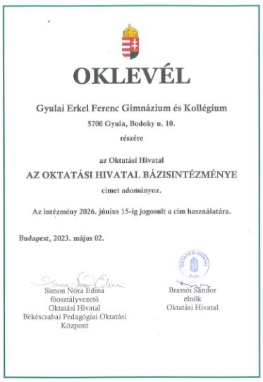 A Gyulai Erkel Ferenc Gimnázium és Kollégium az Oktatási Hivatal Bázisintézménye